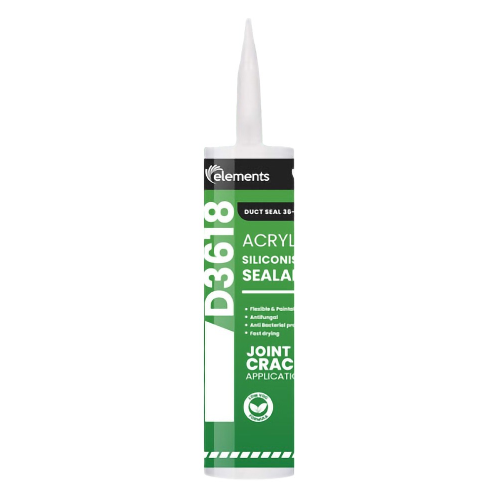 ELEMENTS D3618 Acrylic Sealant is ideal for sealing low movement joints, as a flexible crack filler before painting jobs, for sealing construction frameworks e.g. between window and door frames and walls: Suitable for Duct seal Joints, also suitable as an adhesive for bonding. If there is any uncertainty regarding the application, adhesion tests should be carried out.